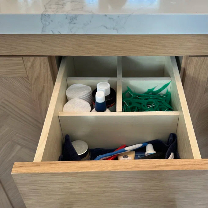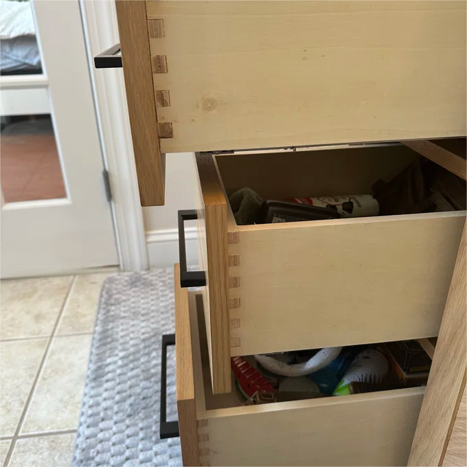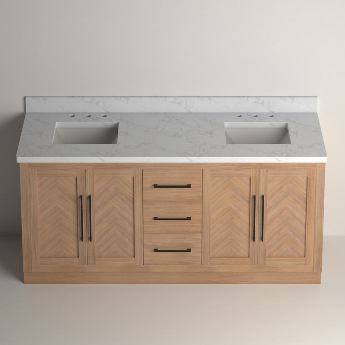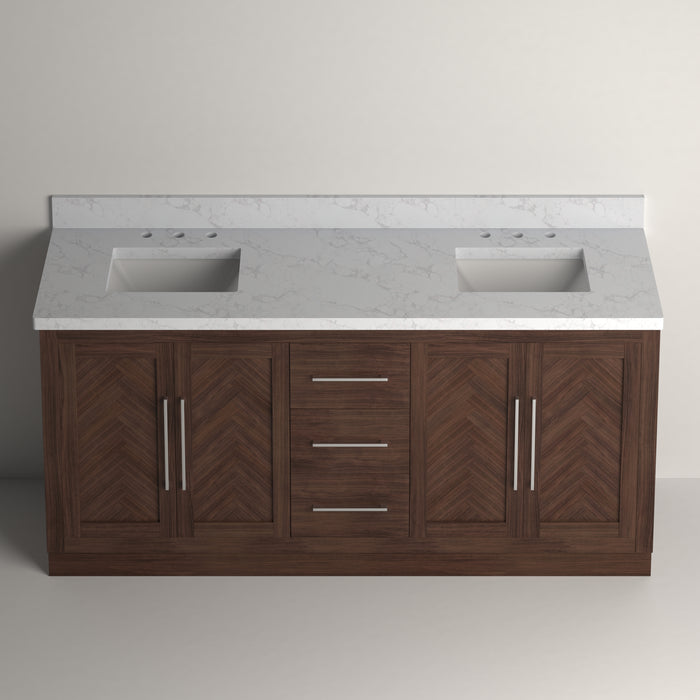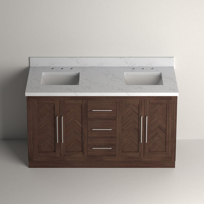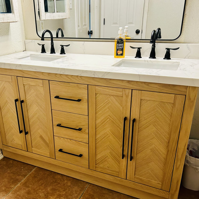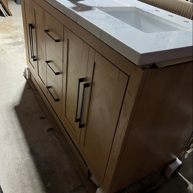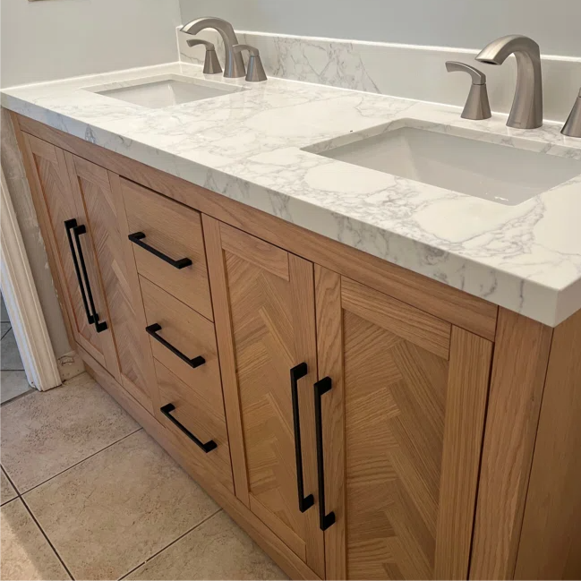 Vivian Collection combines rustic warmth with modern elegance through bold chevron fronts, solid hardwood construction, and a Statuario quartz countertop. With soft-close drawers, spacious cabinets, and sleek hardware in brushed nickel or matte black, it offers smart storage and timeless style. Pre-assembled with CUPC-certified sinks and faucet-ready, Vivian makes installation effortless while leaving a lasting impression.