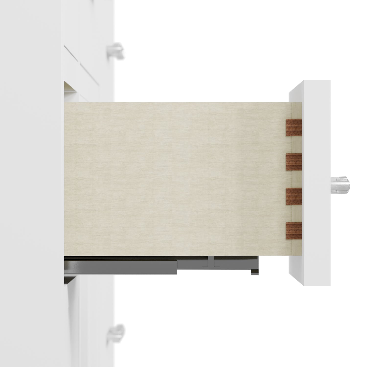 The Caroline Parkway features a side-sink layout with extra storage, including soft-close drawers and a detachable cabinet for customizable space. Made from solid birch with a white quartz top, it combines durability and a clean, elegant look.