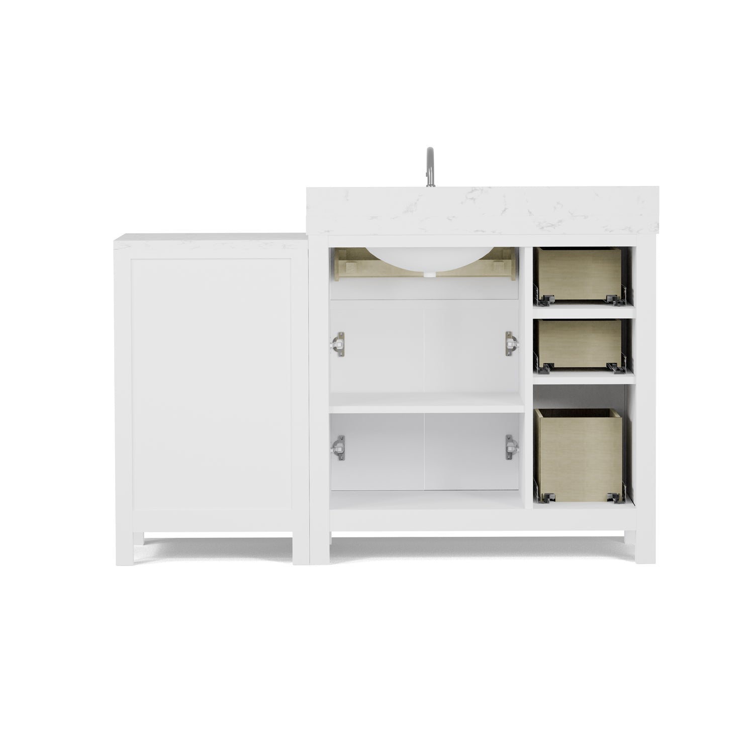 The Caroline Parkway 57" bathroom vanity with side cabinet blends clean design with everyday practicality. Its right-offset sink layout provides more usable counter space, while the tall side cabinet offers vertical storage for larger bathroom essentials like towels, bins, or cleaning products. Complementing this functional layout are four soft-close drawers and two framed cabinet doors, designed to keep smaller items organized and out of sight. A bright white finish and minimalist hardware give the vanity a modern yet timeless appearance that fits effortlessly into transitional interiors. Above, a durable white quartz countertop adds both texture and protection, resisting stains and scratches with minimal upkeep. The smooth surface is paired with a ceramic undermount sink, which sits flush for easy cleaning and a streamlined look. Altogether, this single sink bathroom vanity is a durable, space-efficient solution that adds everyday convenience to any modern bath setup.