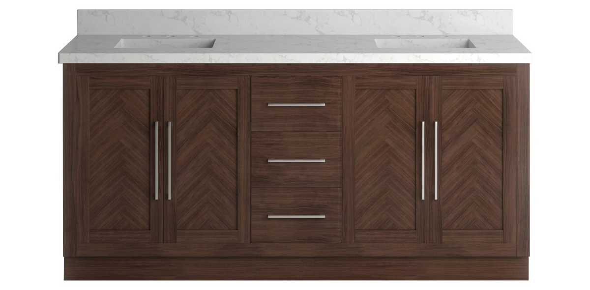 Elevate your space with the Vivian 72" bathroom vanity in solid wood. Bold V-design meets warm modern style. Ample storage and soft-close features add function and elegance.